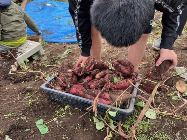 学院内の畑のさつまいも掘りをしました。さつまいもの葉、つるをたどっていくと、さつまいもが畑から少しだけ顔を出しているのを発見、周りの土を掘って、掘って、さつまいもを引っ張って、次々と大きなお芋を収穫しました。