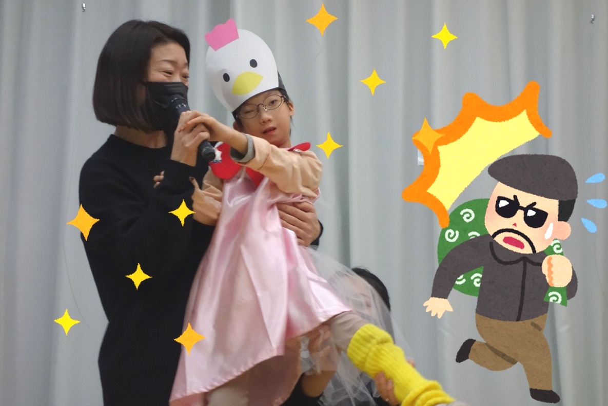 今年の幼小グループは、5匹のかわいい動物たちが、それぞれの特技で泥棒に立ち向かいました!まずはロバが華麗なドラムのバチさばきで、泥棒の足をすくませることに成功!すかさずイヌが、完璧すぎる「ふとん干しのポーズ」で泥棒にショックを与えます!するとネコは、なんと10秒も鉄棒にぶら下がるという大技を繰り出して、泥棒は仰天!!最後はめんどり姉妹が、プッシュプッシュの力強い腕立てふせと豪快な飛び蹴りで、見事泥棒を撃退したのでした!